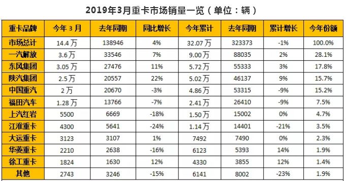 品牌情況如下圖所示,一汽解放繼續(xù)保持行業(yè)老大的地位,3月份銷售重卡3.6萬輛,今年一季度累計銷售重卡超9萬輛,市場份額達到28.1%,同樣穩(wěn)居行業(yè)銷量冠軍寶座。第二名和第三名發(fā)生了“易位”。3月份,東風重卡以3.05萬輛的月銷量成績,超過中國重汽(2萬輛),重回行業(yè)第二。