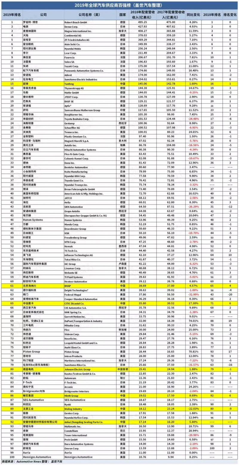 摘要:2019全球汽車零部件配套供應(yīng)商百?gòu)?qiáng)榜中,中國(guó)企業(yè)數(shù)量較去年再增1家。