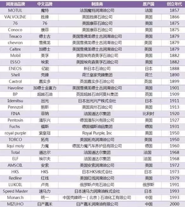 表:世界主要發(fā)動(dòng)機(jī)潤(rùn)滑油制造商及品牌名錄(排名不分先后)