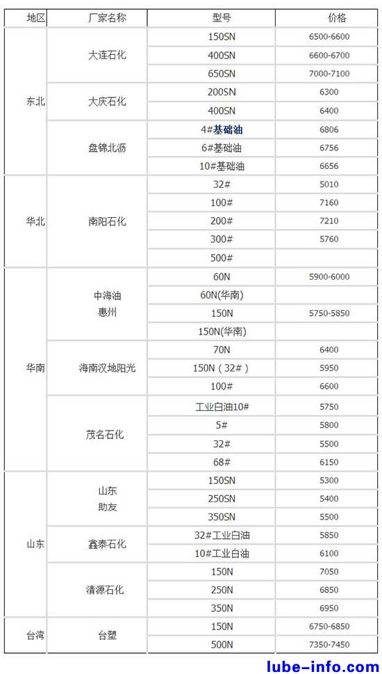 國內(nèi)基礎(chǔ)油價(jià)格一覽(元/噸)