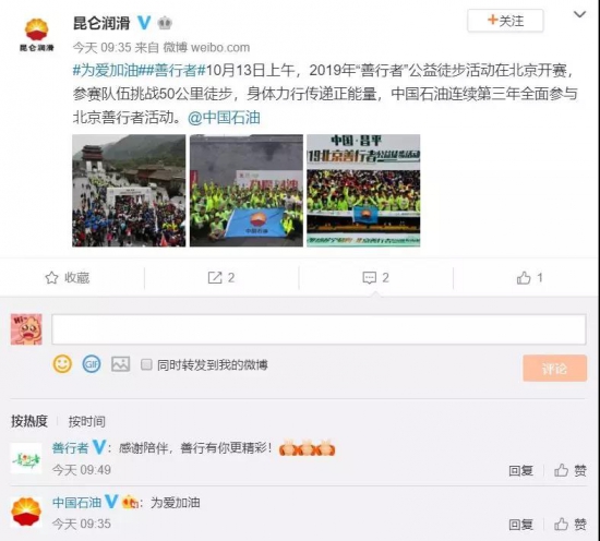 10月13日上午,2019年“善行者”公益徒步活動在北京鳴槍開賽,昆侖潤滑油作為中國石油旗下的潤滑油公司與集團一起為所有“善行者”提供服務(wù)。參賽隊伍徒步挑戰(zhàn)50公里距離,身體力行傳遞正能量。今年是中國石油連續(xù)第三年以“為愛加油”為主題全面參與北京善行者活動,本次不僅有來自中國石油旗下的30支隊伍參與徒步挑戰(zhàn),還擔(dān)負(fù)起CP3站點的服務(wù)保障工作。