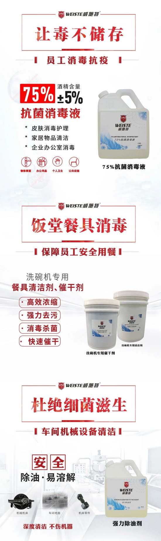 抗疫不忘生產(chǎn),各行各業(yè)正在陸續(xù)有序復(fù)工復(fù)產(chǎn)。曙光在前,而拐點(diǎn)未至,防控莫松,保障復(fù)工復(fù)產(chǎn)安全,我們需要可信賴的“威施特”消毒洗護(hù)產(chǎn)品。
