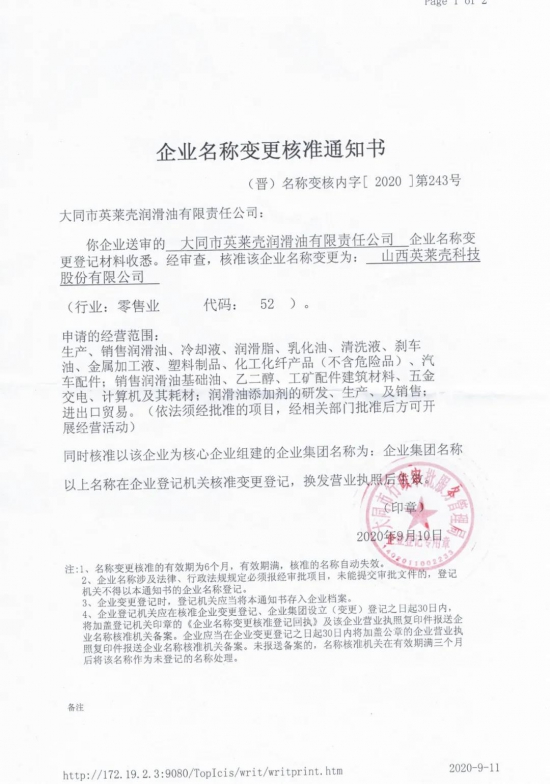 本公司由于上市需要,經(jīng)大同市行政審批服務(wù)管理局審核,大同市行政審批局登記,自2020年09月17日起,公司名稱(chēng)由原來(lái)的“大同市英萊殼潤(rùn)滑油有限責(zé)任公司”變更登記為“山西英萊殼科技股份有限公司”。