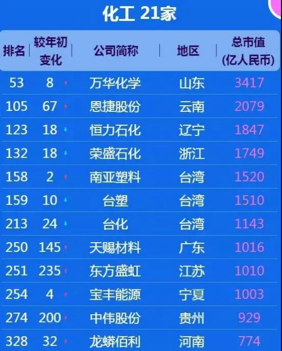 化工行業(yè)有21家進入500強,市值破千億元的有:萬華化學總市值為3417億元;恩捷股份為2079億元;恒力股份為1847億元;榮盛石化為1749億元;南亞塑料為1520億元;臺塑為1510億元;臺化為1143億元;天賜材料為1016億元;東方盛虹為1010億元;寶豐能源為1003億元。