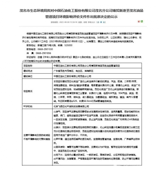 與此同時,茂名市生態(tài)環(huán)境局?jǐn)M對中國石油化工股份有限公司茂名分公司博賀新港至茂名油品管道項目環(huán)境影響評價文件作出批準(zhǔn)決定的公示。