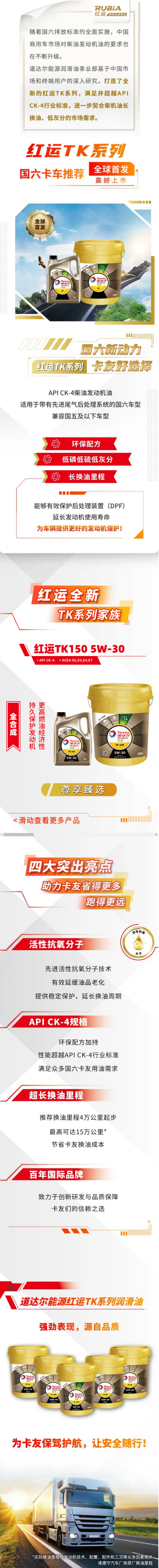 摘要:道達(dá)爾能源潤滑油事業(yè)部基于中國市場和終端用戶的深入研究,打造了全新的紅運(yùn)TK系列,滿足并超越API CK-4行業(yè)標(biāo)準(zhǔn),進(jìn)一步契合柴機(jī)油長換油、低灰分的市場需求。