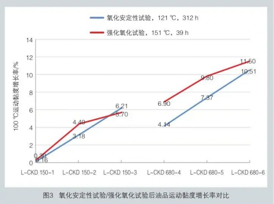 從圖3和表3中可以看出:在L-CKD150黏度級別中,151℃和121℃條件下的L-CKD150-1、L-CKD 150-2、L-CKD150-3三個齒輪油氧化數(shù)據(jù)差值較小,僅為-0.51%~1.22%,這說明在151℃和 121℃兩個條件下的氧化反應進程大致相同,無論是趨勢還是具體數(shù)值都表現(xiàn)出較好的一致性。