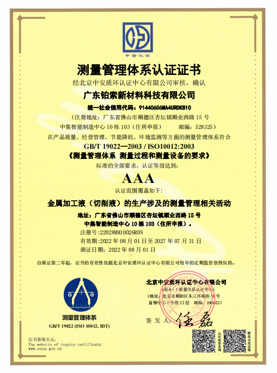 2022年8月,廣東鉑索新材料科技有限公司順利通過ISO10012:2003測量管理體系認(rèn)證,并獲得認(rèn)證證書。本次審核通過進一步提升了鉑索的核心競爭力和影響力,是對鉑索未來發(fā)展不可或缺的激勵與鞭策,也是標(biāo)志著鉑索的品質(zhì)管理再進一步與世界接軌,構(gòu)建世界級品質(zhì)管理水平。