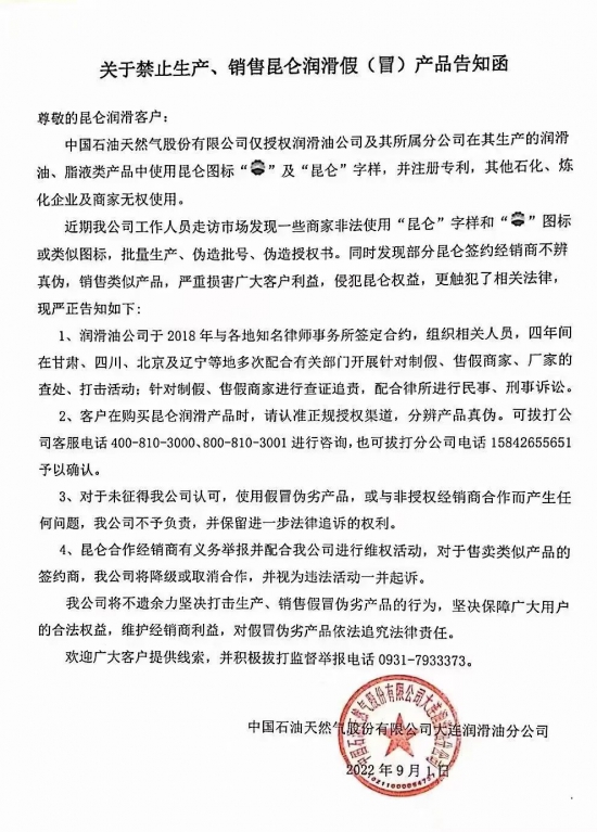 關(guān)于禁止生產(chǎn)、銷售昆侖潤滑假(冒)產(chǎn)品告知函