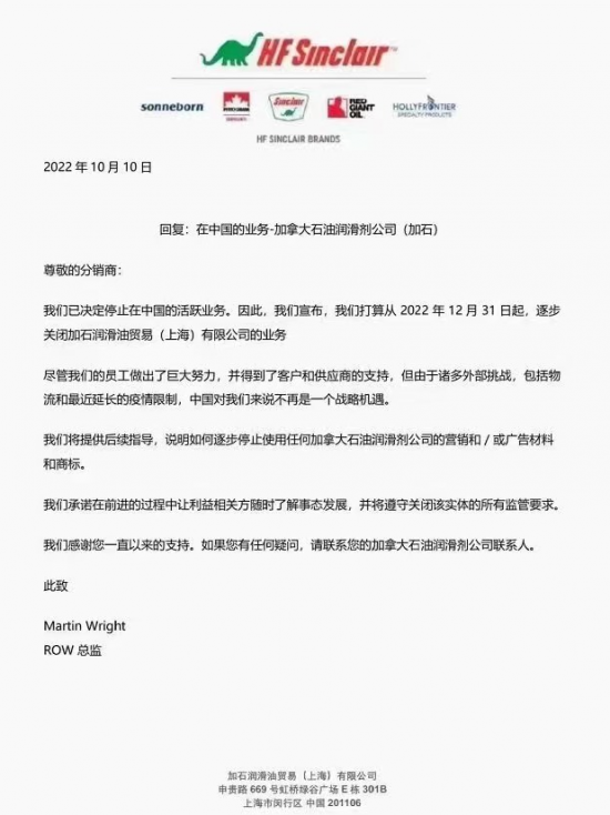 據(jù)悉,知名外資品牌加拿大石油潤(rùn)滑劑公司在致其分銷商的函中表示,“我們已經(jīng)決定停止在中國(guó)的活躍業(yè)務(wù),因此,我們宣布,我們打算從2022年12月31日起,逐步關(guān)閉加石油潤(rùn)滑油貿(mào)易(上海)有限公司的業(yè)務(wù)。”函件強(qiáng)調(diào),“盡管我們的員工做出了巨大努力,并得到了客戶和供應(yīng)商的支持,但由于諸多外部調(diào)整,包裝物流和最近延長(zhǎng)的疫情限制,中國(guó)對(duì)我們來(lái)說不再是一個(gè)戰(zhàn)略機(jī)遇”。