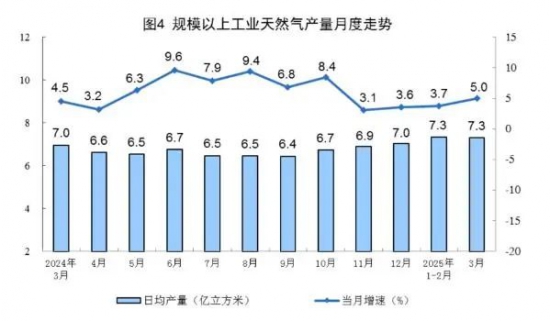 天然氣生產(chǎn)穩(wěn)定增長。3月份,規(guī)上工業(yè)天然氣產(chǎn)量227億立方米,同比增長5.0%,增速比1—2月份加快1.3個百分點(diǎn);日均產(chǎn)量7.3億立方米。